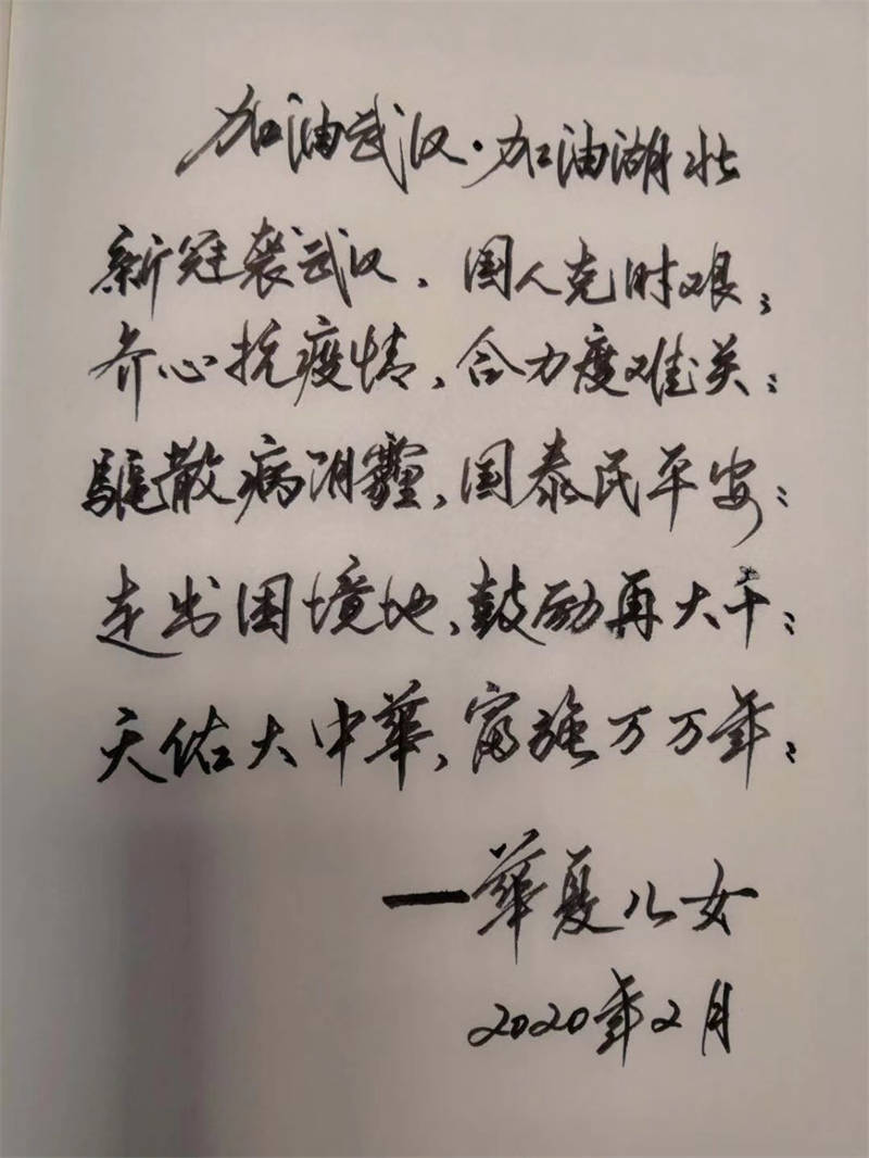 紙短情長述不盡心中敬意,以詩傳情道不盡心中謝意,詩詞歌賦雖不能驅(qū)散冠狀病毒,但能帶給人們百折不撓的勇氣和必勝的信心。以筆為槍能“齊心抗疫情,合力度難關(guān)”,以詩傳情能“驅(qū)散病陰霾,國泰民平安”,以筆墨應(yīng)援能用筆觸的溫度,溫暖那些戰(zhàn)役中英雄。