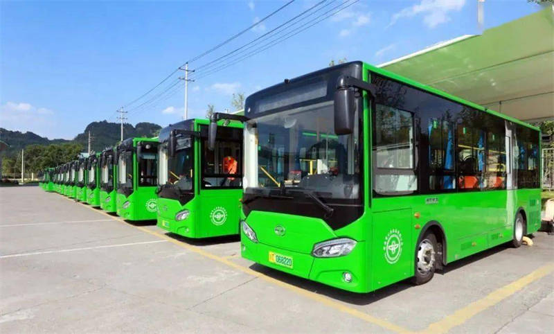 煥然一新的綠色新能源電動公交車列裝上線運營