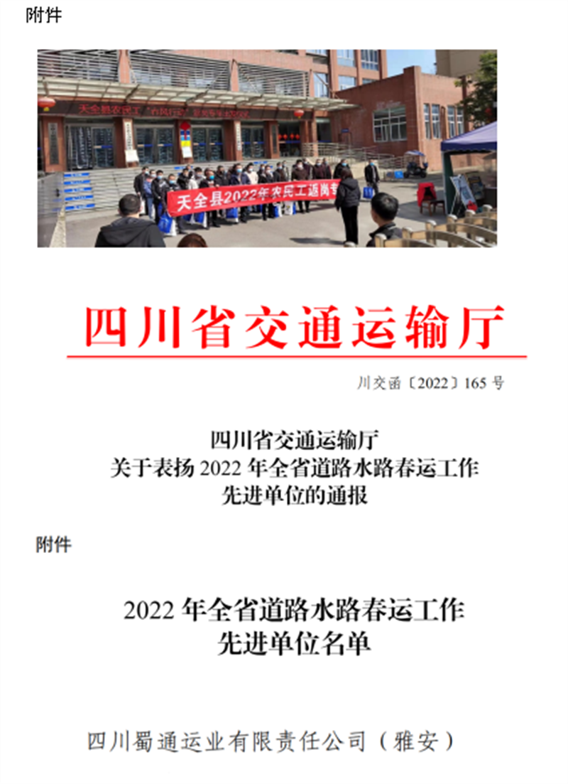蜀通公司榮獲“2022年全省道路水路春運(yùn)工作先進(jìn)單位”稱號(hào)