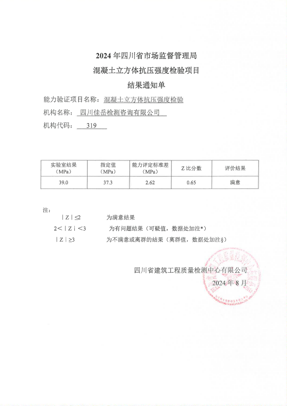 喜訊!四川佳岳檢測咨詢有限公司(簡稱:佳岳公司)在2024年度四川省市場監(jiān)督管理局組織的檢驗(yàn)檢測機(jī)構(gòu)能力驗(yàn)證項目中,參與的“混凝土立方體抗壓強(qiáng)度檢驗(yàn)”項目獲得“滿意”評價。