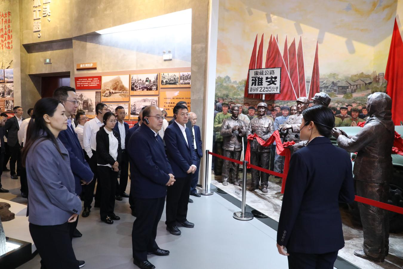 在318公路文化體驗館,調(diào)研組一行依次深入?yún)⒂^“路無窮盡”“景無止境”“此生必駕”“行以致遠(yuǎn)”四大主題展廳,深刻領(lǐng)悟“兩路”精神的內(nèi)涵實質(zhì)。宮輝指出,“兩路”精神不僅是交通建設(shè)者們的精神豐碑,更是激勵當(dāng)代交通人不斷前行的強(qiáng)大動力。交建集團(tuán)可在如何將該項目打造成為川藏線上的新亮點,成為川藏線上體現(xiàn)“兩路”精神“一不怕苦、二不怕死,頑強(qiáng)拼搏、甘當(dāng)路石,軍民一家、民族團(tuán)結(jié)”的縮影代表,推動交旅融合高效發(fā)展。
