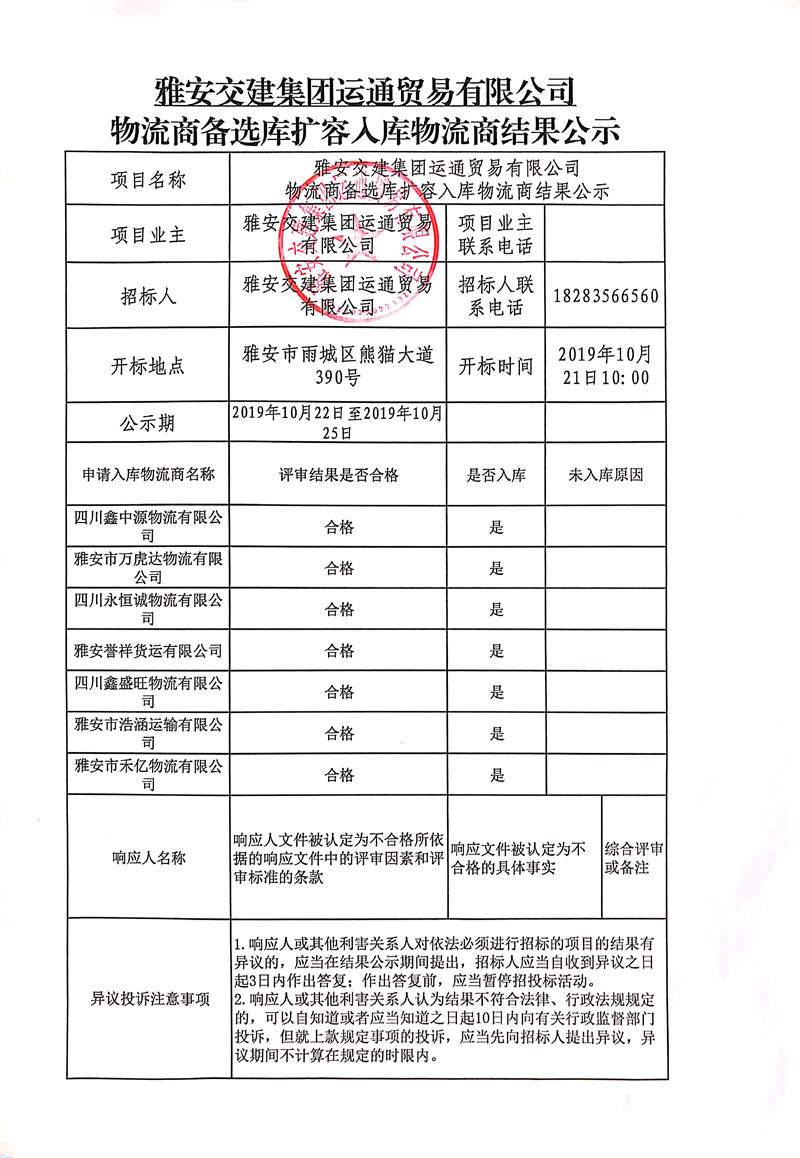雅安交建集團(tuán)運(yùn)通貿(mào)易有限公司物流商備選庫擴(kuò)容入庫物流商結(jié)果公示