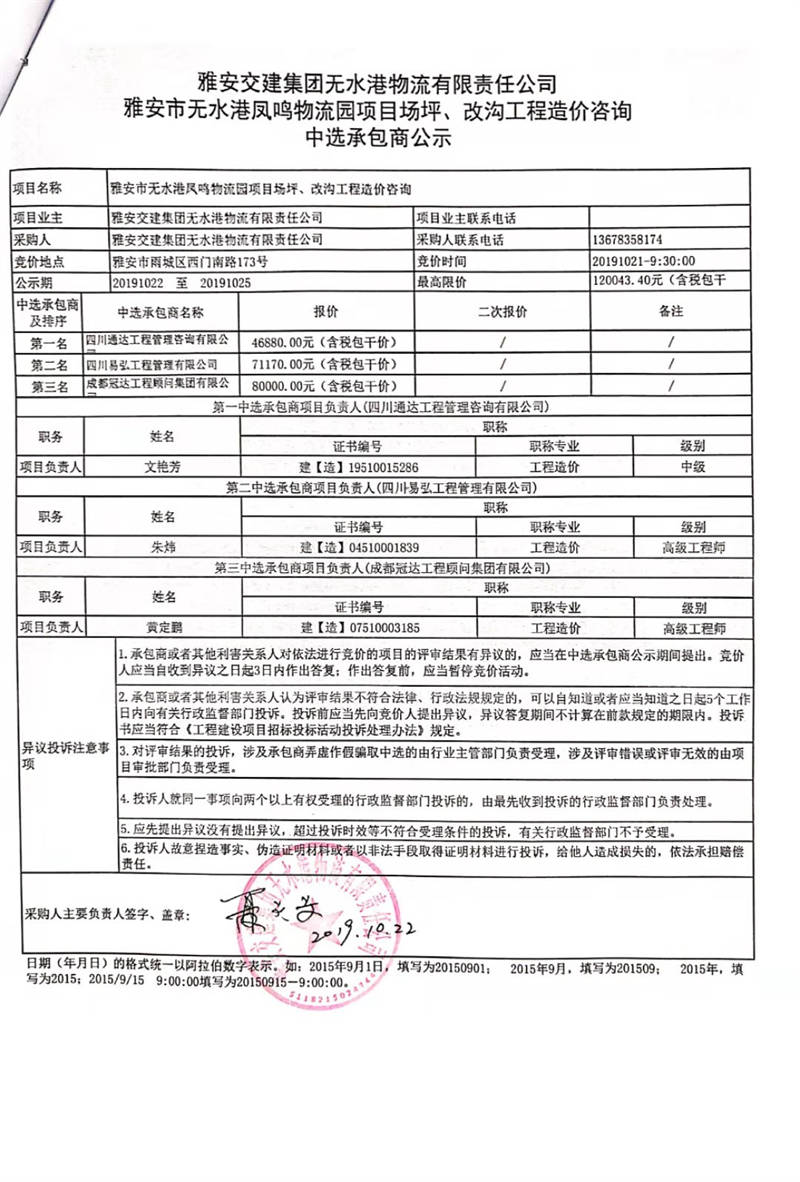 雅安交建集團無水港物流有限責任公司雅安市無水港鳳鳴物流園項目場坪、改溝工程造價咨詢中選承包商公示