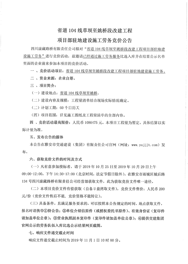 四川康藏路橋有限責(zé)任公司省道104線草壩至姚橋段改建工程項(xiàng)目部駐地建設(shè)施工勞務(wù)競(jìng)價(jià)公告