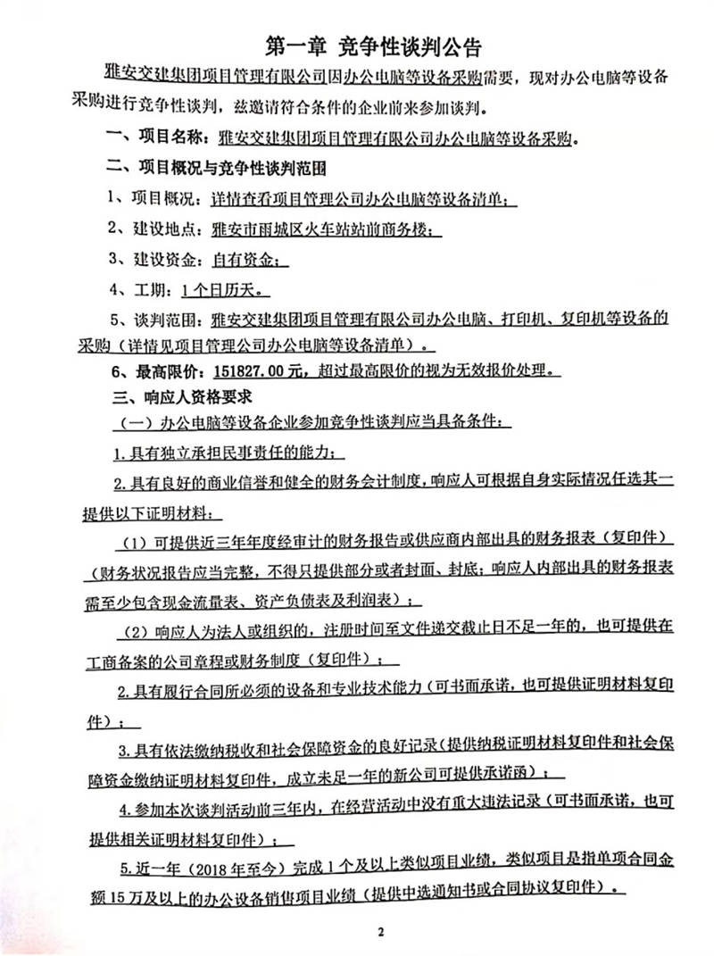 雅安交建集團(tuán)項目管理有限公司辦公電腦等設(shè)備采購競爭性談判公告