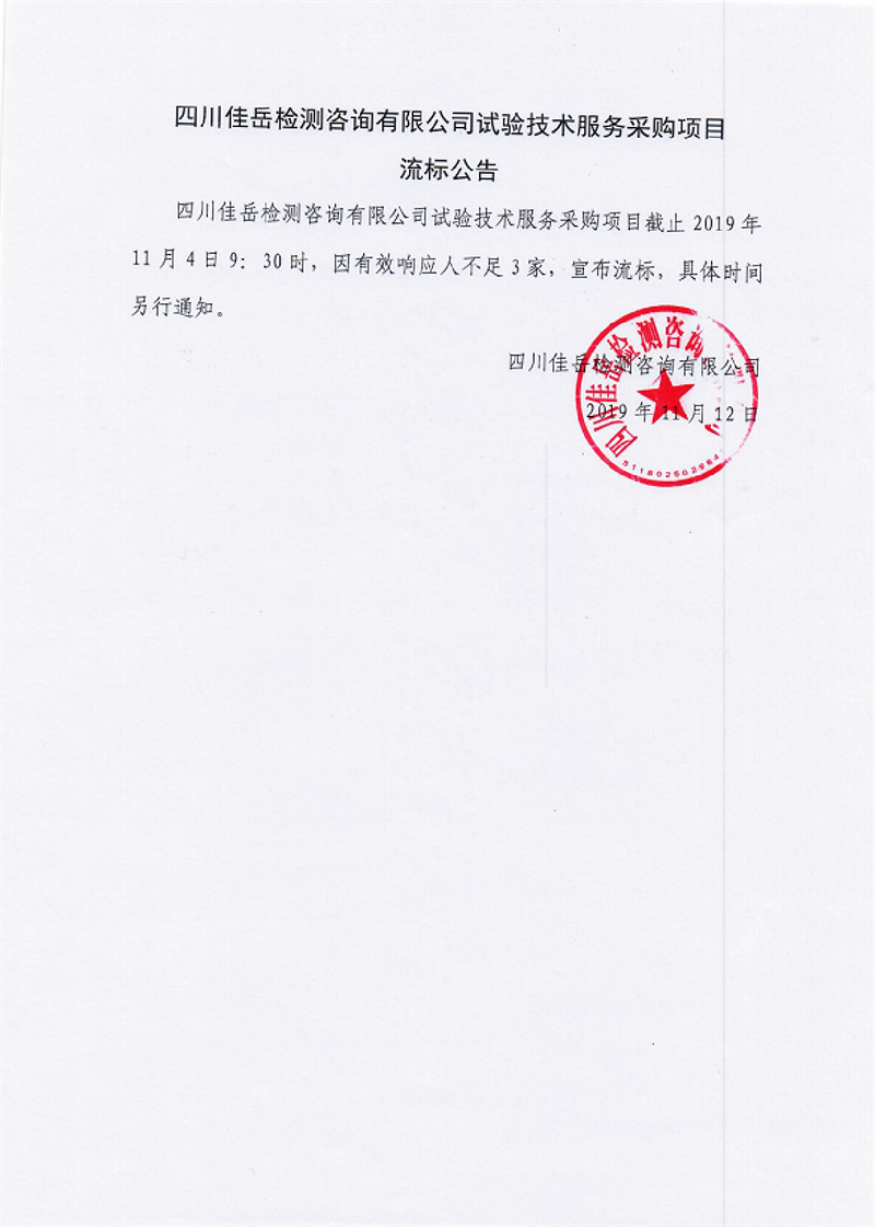 四川佳岳檢測咨詢有限公司試驗技術(shù)服務(wù)采購項目流標(biāo)公告