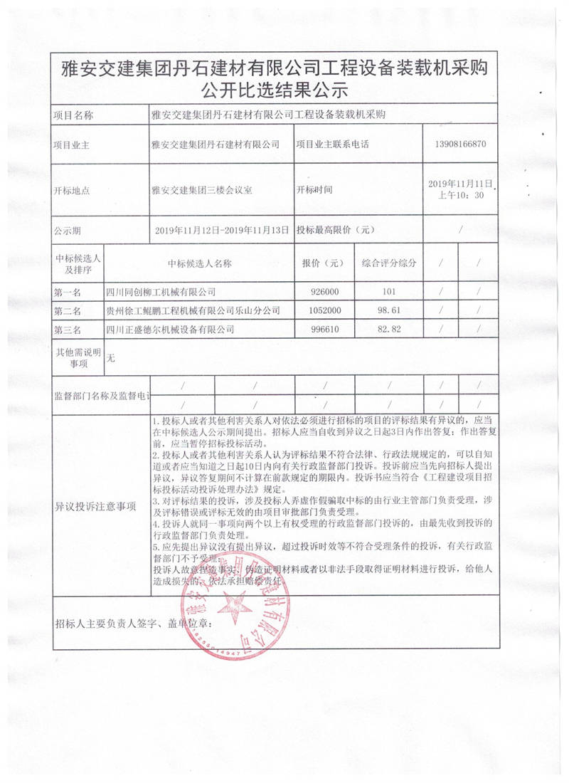 雅安交建集團(tuán)丹石建材有限公司工程設(shè)備裝載機(jī)采購(gòu)公開比選結(jié)果公示