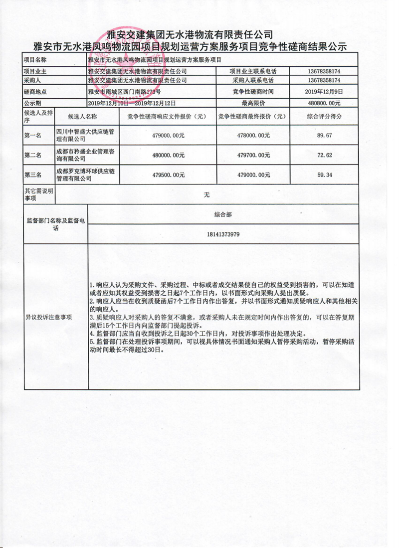 雅安交建集團無水港物流有限責(zé)任公司雅安市無水港鳳鳴物流園項目規(guī)劃運營方案服務(wù)項目競爭性磋商結(jié)果公示