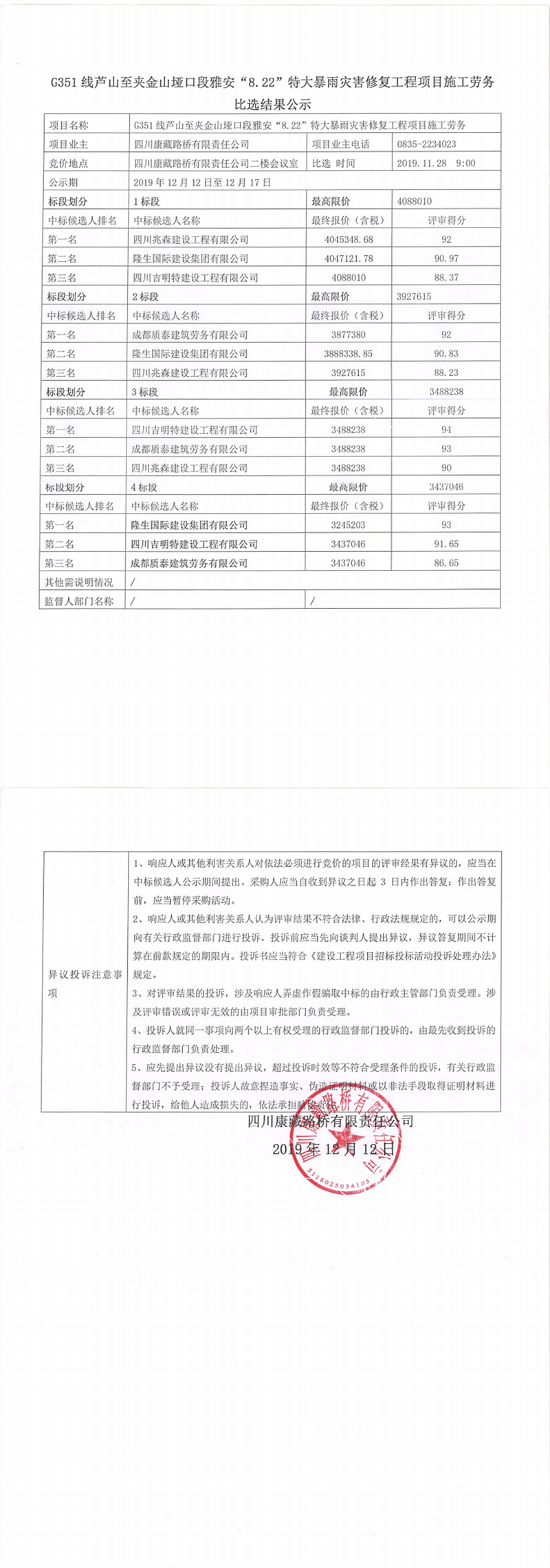 四川康藏路橋有限責(zé)任公司G351線蘆山至夾金山埡口段雅安“8.22”特大暴雨災(zāi)害修復(fù)工程項目施工勞務(wù)比選結(jié)果公示