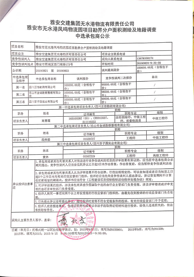 雅安交建集團無水港物流有限責任公司雅安市無水港鳳鳴物流園項目勘界分戶面積測繪及地籍調(diào)查中選承包商公示