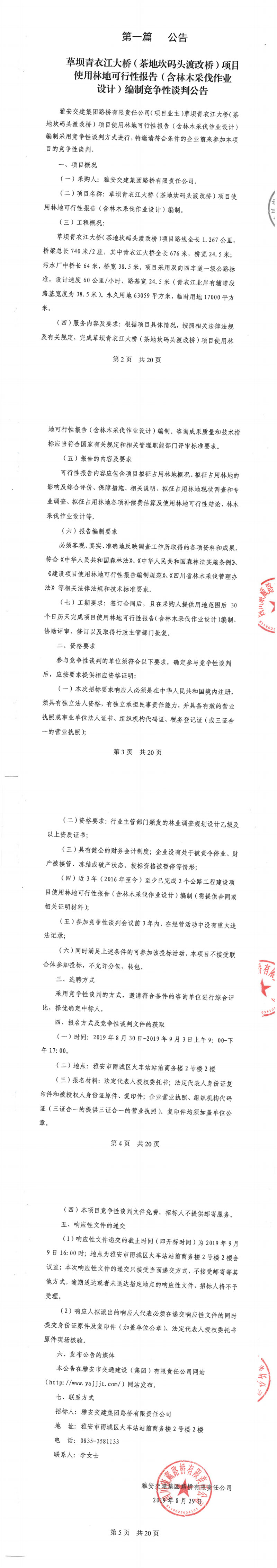 雅安交建集團(tuán)路橋有限責(zé)任公司草壩青衣江大橋(茶地坎碼頭渡改橋)使用林地可行性報(bào)告(含林木采伐作業(yè)設(shè)計(jì))編制競爭性談判公告