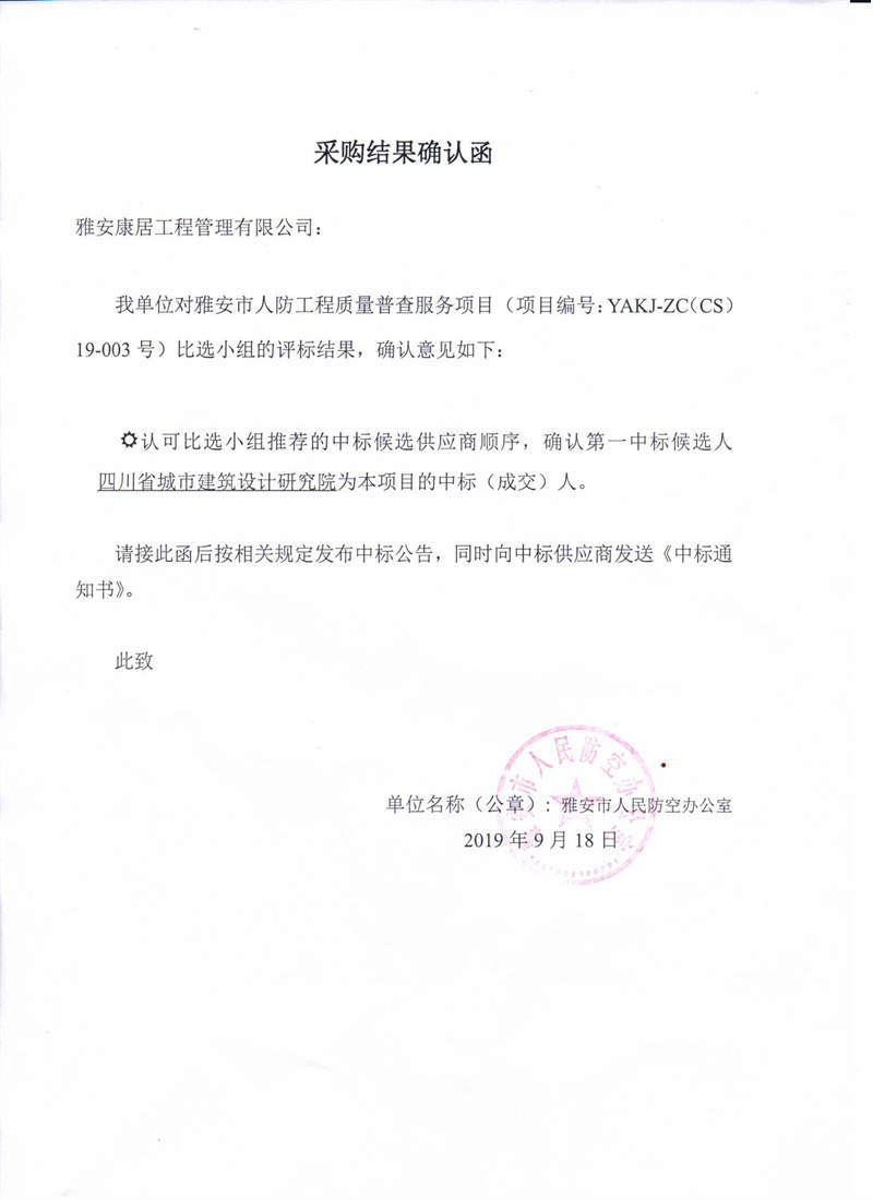 雅安市人民防空辦公室雅安市人防工程質(zhì)量普查服務(wù)項(xiàng)目評(píng)標(biāo)結(jié)果公示
