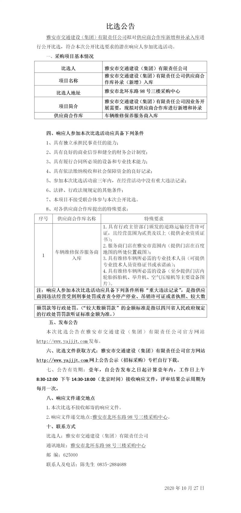 雅安市交通建設(shè)(集團)有限責任公司供應(yīng)商合作庫補錄(新增)入庫比選公告