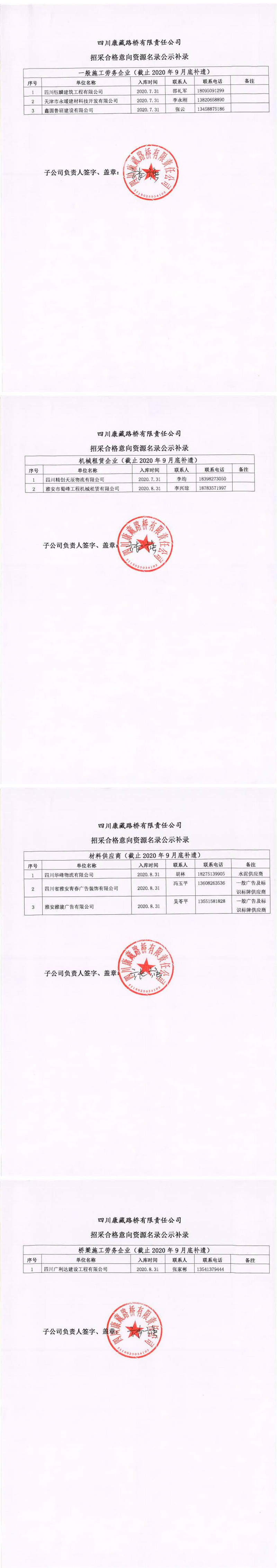 四川康藏路橋有限責(zé)任公司招采合格意向資源名錄公示補(bǔ)錄