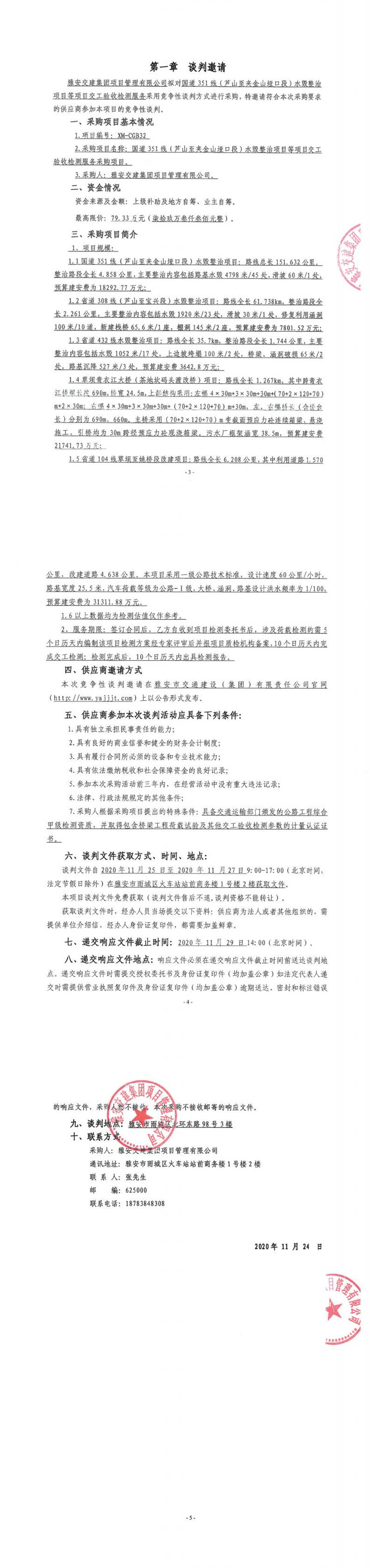 雅安交建集團項目管理有限公司國道351線(蘆山至夾金山埡口段)水毀整治項目等項目交工驗收檢測服務采購項目競爭性談判公告