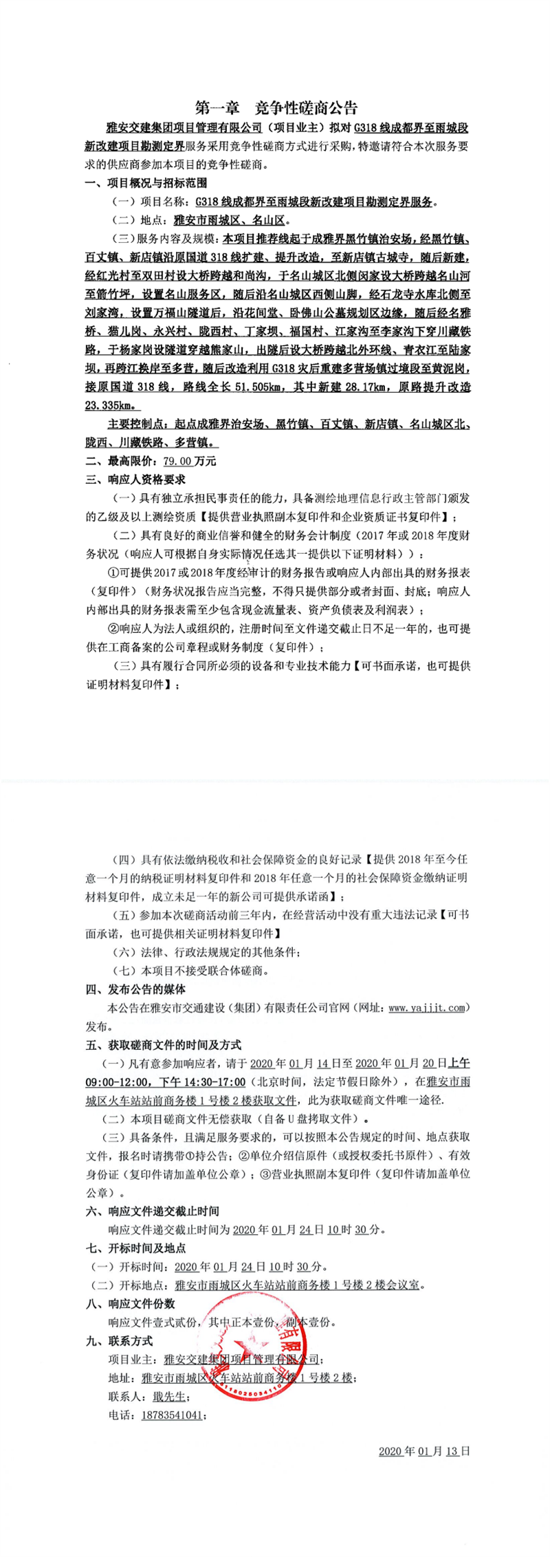 雅安交建集團(tuán)項(xiàng)目管理有限公司G318線成都界至雨城段新改建項(xiàng)目勘測(cè)定界服務(wù)競(jìng)爭(zhēng)性磋商公告