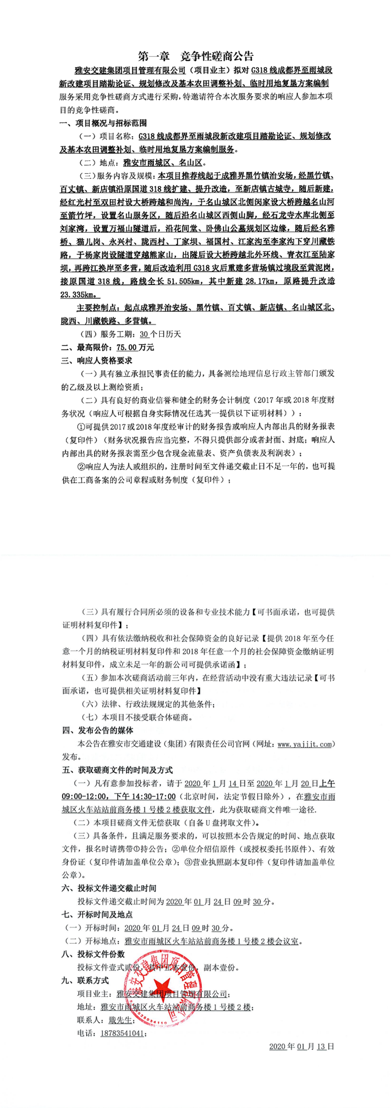 雅安交建集團項目管理有限公司G318線成都界至雨城段新改建項目踏勘論證、規(guī)劃修改及基本農(nóng)田調(diào)整補劃、臨地用地復(fù)墾方案編制服務(wù)競爭性磋商公告