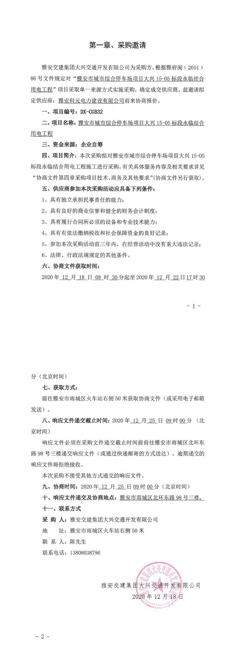 雅安交建集團(tuán)大興交通開發(fā)有限公司雅安市城市綜合停車場(chǎng)項(xiàng)目大興15-05標(biāo)段永臨結(jié)合用電工程單一來源采購邀請(qǐng)