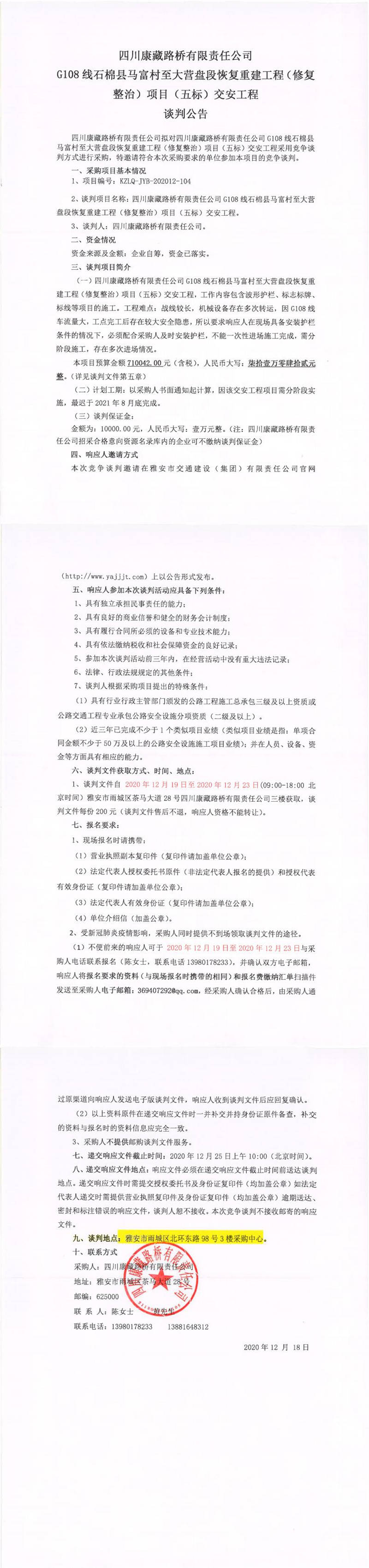 四川康藏路橋有限責(zé)任公司G108線石棉縣馬富村至大營盤段恢復(fù)重建工程(修復(fù)整治)項(xiàng)目(五標(biāo))交安工程談判公告