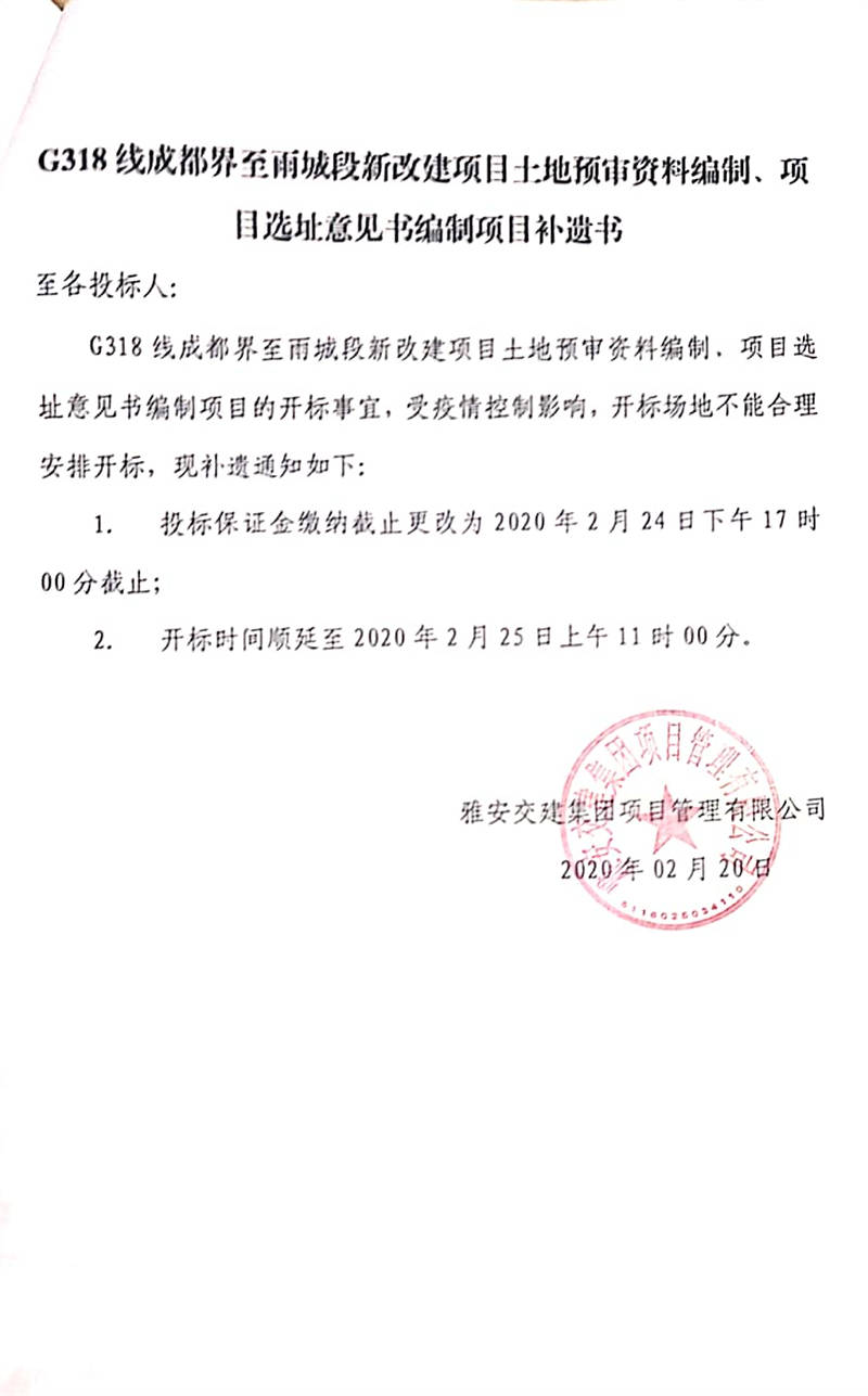 雅安交建集團項目管理有限公司G318線成都界至雨城段新改建項目土地預審資料編制、項目選址意見書編制項目補遺書