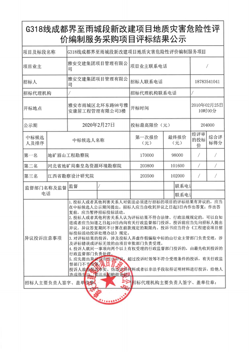 雅安交建集團(tuán)項(xiàng)目管理有限公司G318線成都界至雨城段新改建項(xiàng)目地質(zhì)災(zāi)害危險(xiǎn)性評價(jià)編制服務(wù)項(xiàng)目評標(biāo)結(jié)果公示