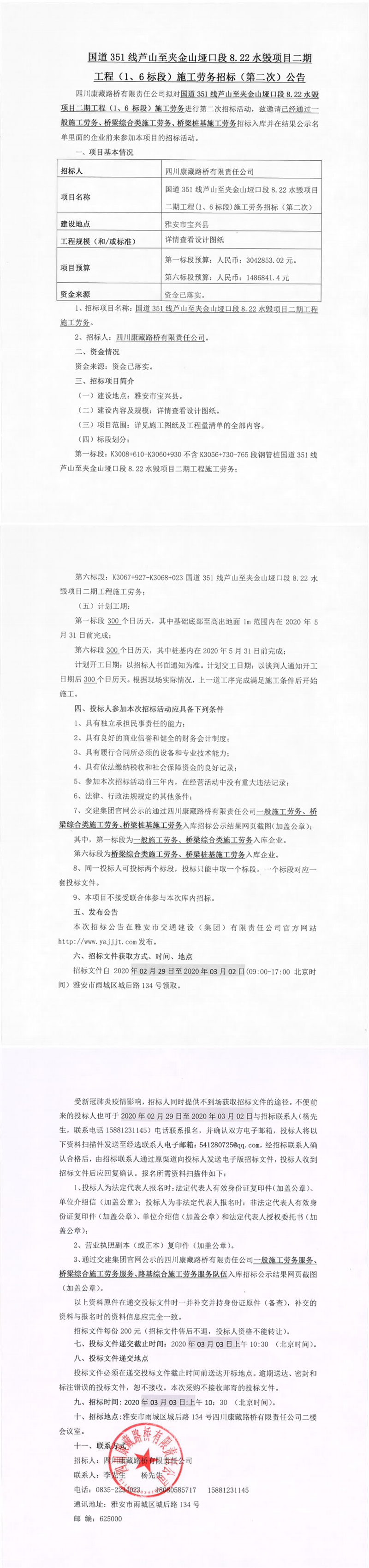 四川康藏路橋有限責(zé)任公司國(guó)道351線(xiàn)蘆山至夾金山埡口8.22水毀項(xiàng)目二期工程(1、6標(biāo)段)施工勞務(wù)招標(biāo)(第二次)公告