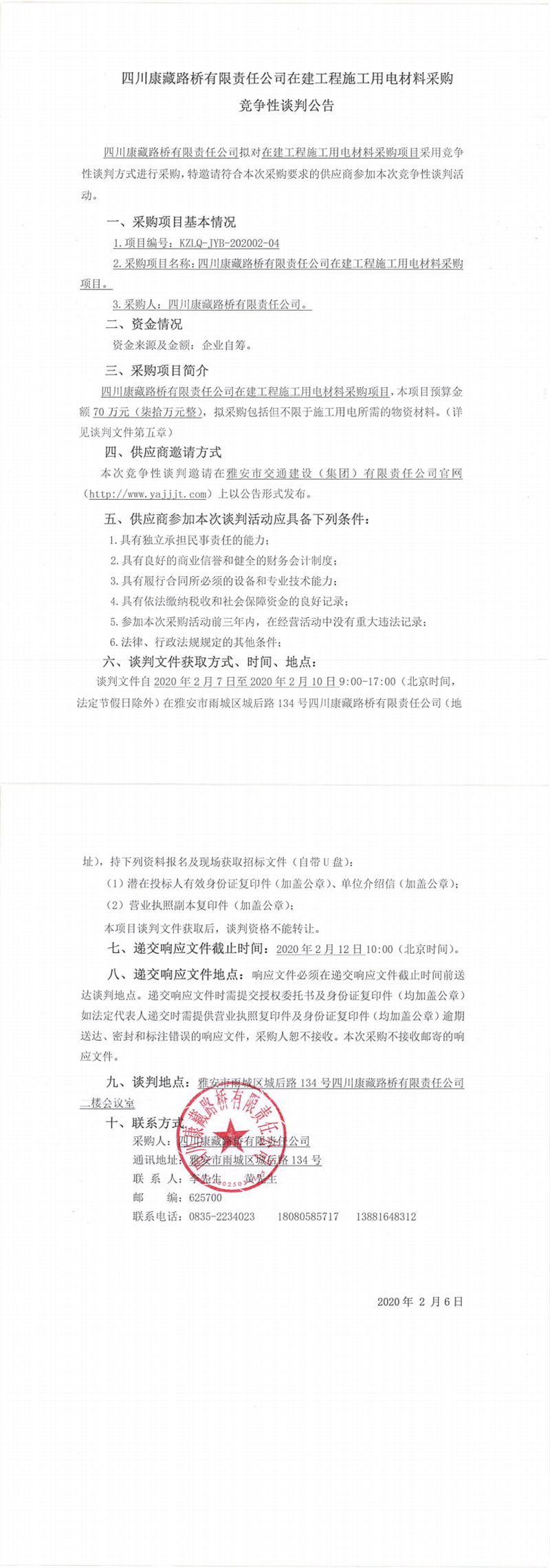四川康藏路橋有限責(zé)任公司在建工程施工用電材料采購(gòu)競(jìng)爭(zhēng)性談判公告