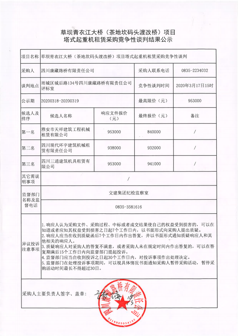 四川康藏路橋有限責任公司草壩青衣江大橋(茶地坎渡改橋)項目塔式起重機租賃采購競爭性談判結果公示