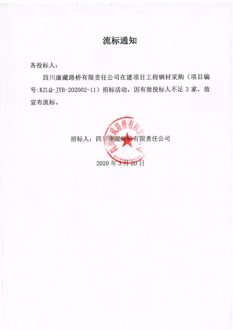 四川康藏路橋有限責任公司在建項目工程鋼材采購流標通知