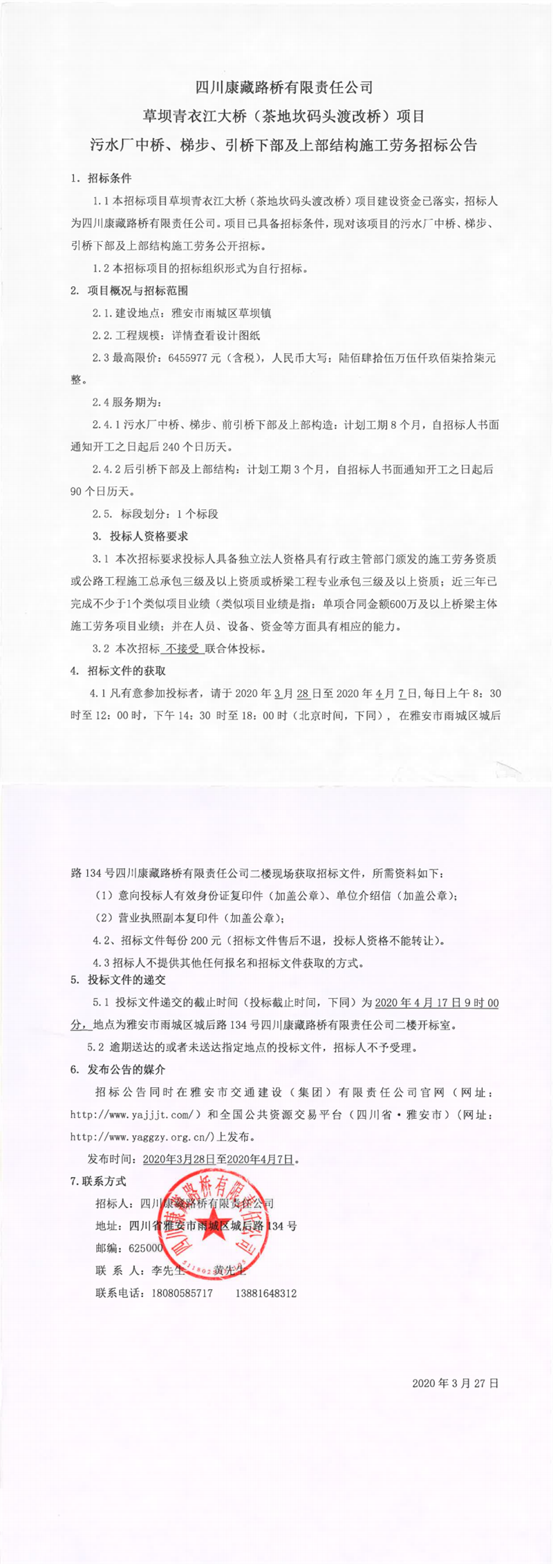 四川康藏路橋有限責(zé)任公司草壩青衣江大橋(茶地坎碼頭渡改橋)項(xiàng)目污水廠中橋、梯步、引橋下部及上部結(jié)構(gòu)施工勞務(wù)招標(biāo)公告