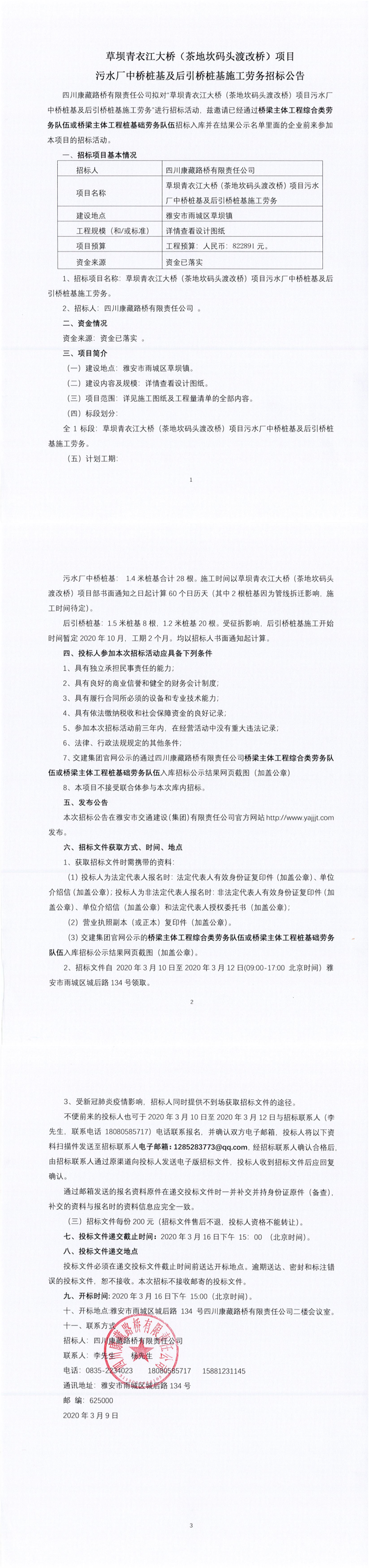 四川康藏路橋有限責任公司草壩青衣江大橋(茶地坎碼頭渡改橋)項目污水廠中橋樁基及后引橋樁基施工勞務招標公告