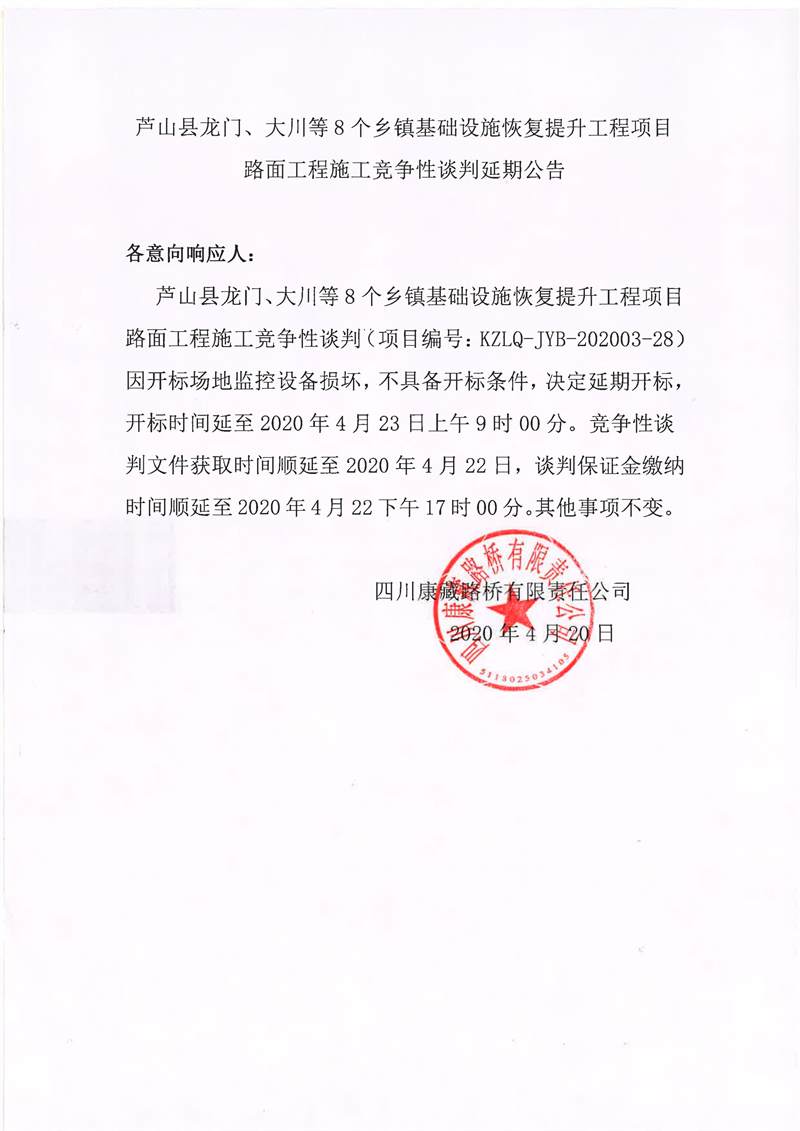 四川康藏路橋有限責(zé)任公司蘆山縣龍門、大川等8個鄉(xiāng)鎮(zhèn)基礎(chǔ)設(shè)施恢復(fù)提升工程項目路面工程施工競爭性談判延期公告