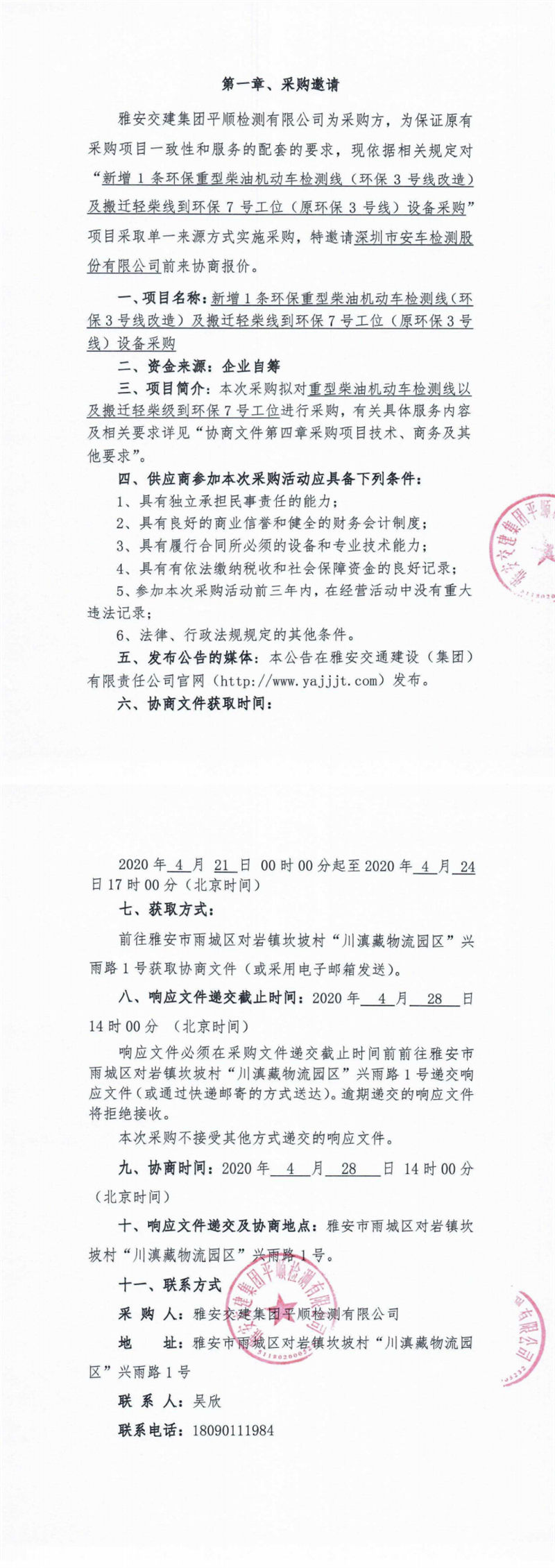 雅安交建集團(tuán)平順檢測(cè)有限公司新增1條環(huán)保重型柴油機(jī)動(dòng)車檢測(cè)線(環(huán)保3號(hào)線改造)及搬遷輕柴線到環(huán)保7號(hào)工位(原環(huán)保3號(hào)線)設(shè)備采購單一來源協(xié)商公告