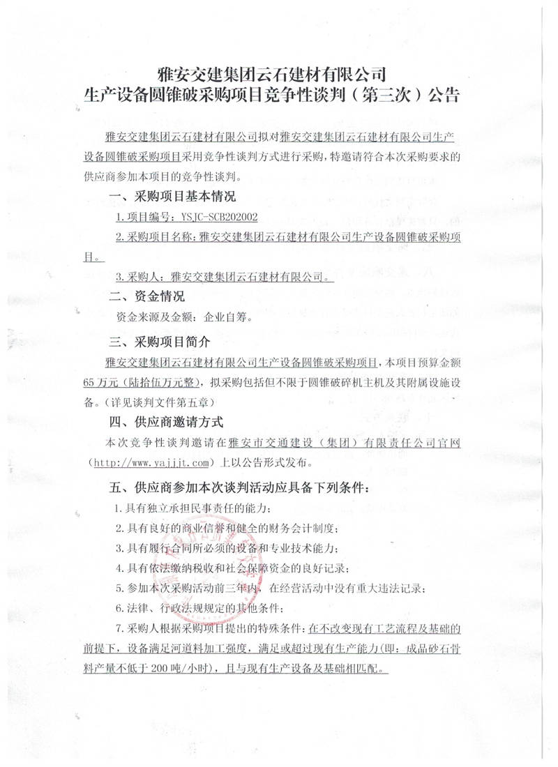 雅安交建集團(tuán)云石建材有限公司生產(chǎn)設(shè)備圓錐破采購項(xiàng)目競(jìng)爭(zhēng)性談判(第三次)公告