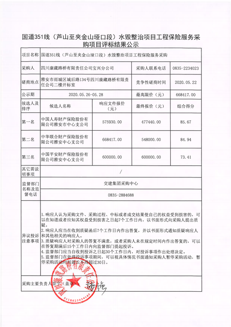 四川康藏路橋有限責任公司寶興分公司國道351線(蘆山至夾金山埡口段)水毀整治項目工程保險服務采購項目評標結果公示