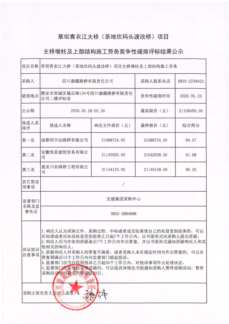 四川康藏路橋有限責任公司草壩青衣江大橋(茶地坎碼頭渡改橋)項目主橋墩柱及上部結構施工勞務競爭性磋商評標結果公示