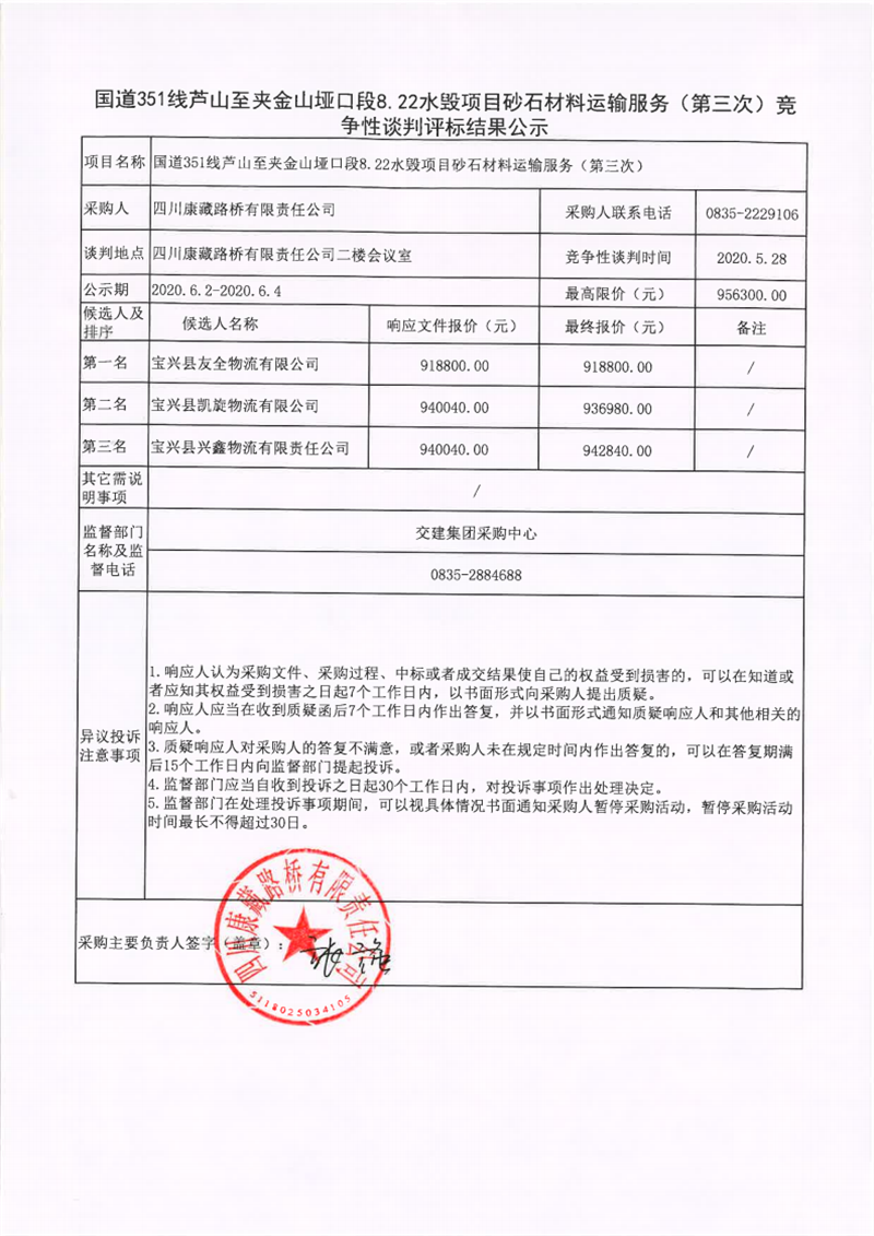 四川康藏路橋有限責(zé)任公司國道351線蘆山至夾金山埡口段8.22水毀項(xiàng)目砂石材料運(yùn)輸服務(wù)(第三次)競爭性談判評標(biāo)結(jié)果公示