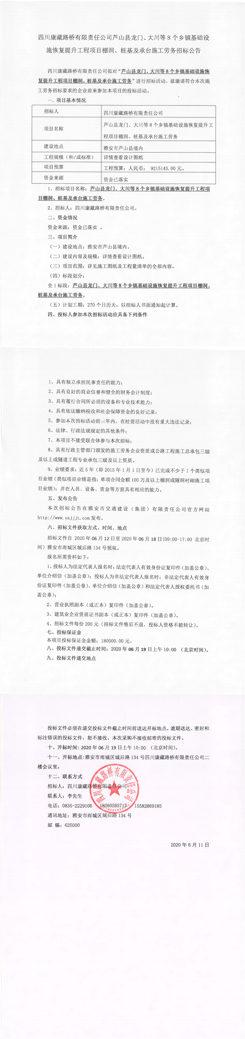 四川康藏路橋有限責(zé)任公司蘆山縣龍門(mén)、大川等8個(gè)鄉(xiāng)鎮(zhèn)基礎(chǔ)設(shè)施恢復(fù)提升工程項(xiàng)目棚洞、樁基及承臺(tái)施工勞務(wù)招標(biāo)公告