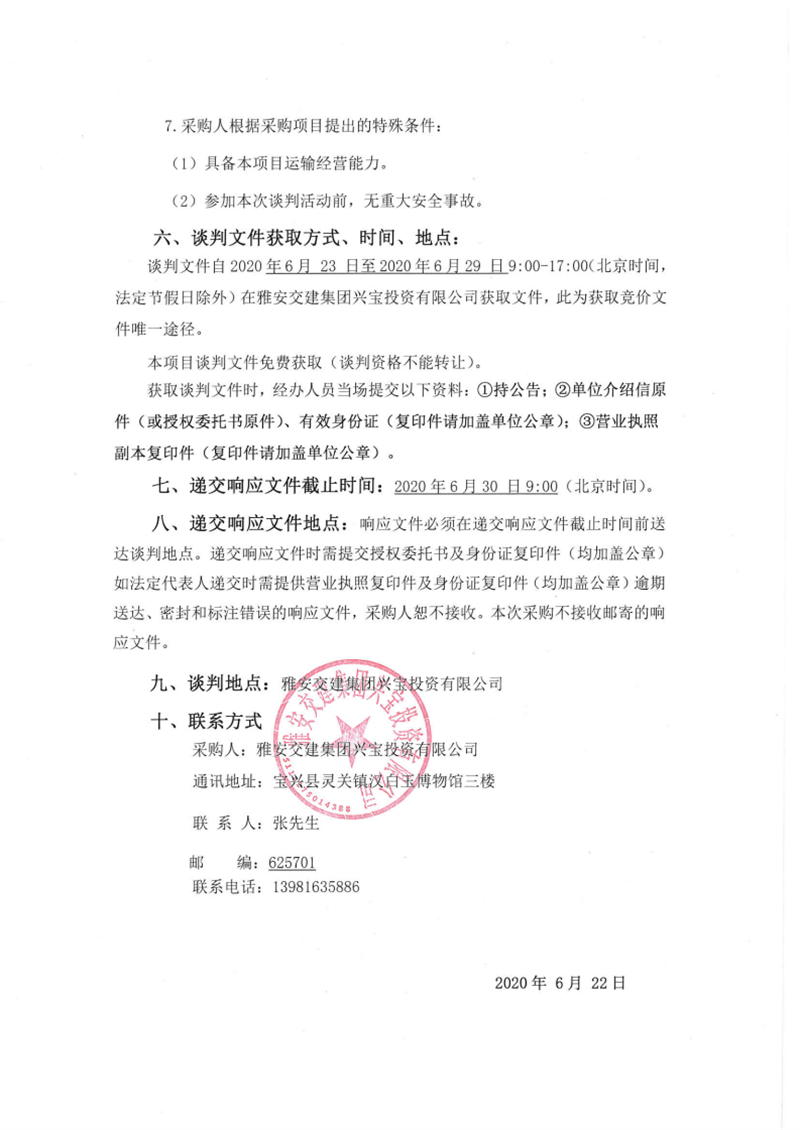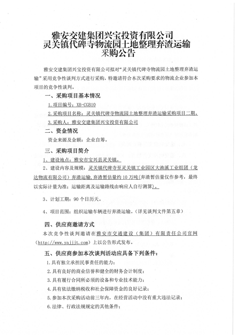 雅安交建集團(tuán)興寶投資有限公司靈關(guān)鎮(zhèn)代碑寺物流園土地整理?xiàng)壴\(yùn)輸采購項(xiàng)目二期競爭性談判公告
