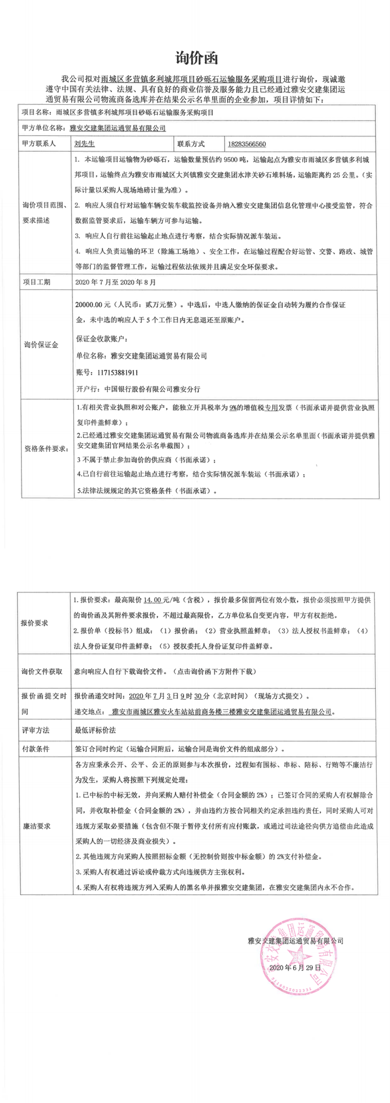 雅安交建集團(tuán)運(yùn)通貿(mào)易有限公司雨城區(qū)多營鎮(zhèn)多利城邦項目砂礫石運(yùn)輸服務(wù)采購項目詢價函