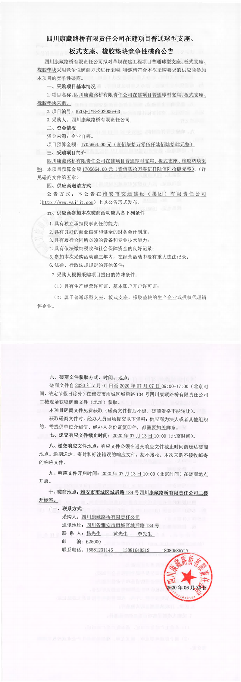 四川康藏路橋有限責任公司在建項目普通球型支座、板式支座、橡膠墊塊采購競爭性磋商公告