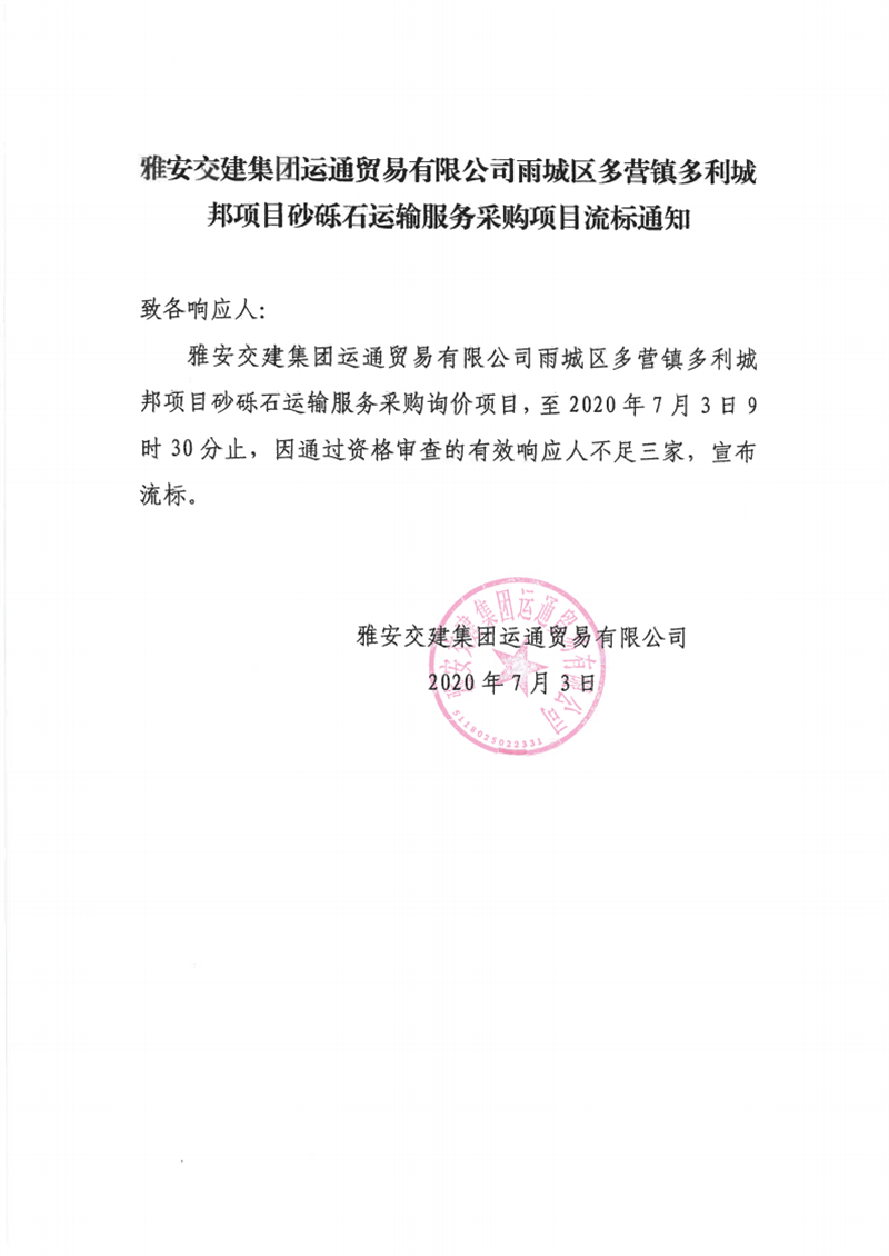雅安交建集團(tuán)運(yùn)通貿(mào)易有限公司雨城區(qū)多營(yíng)鎮(zhèn)多利城邦項(xiàng)目砂礫石運(yùn)輸服務(wù)采購(gòu)項(xiàng)目流標(biāo)通知