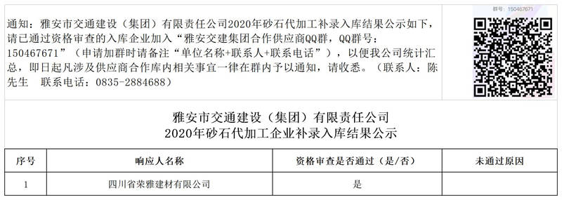 雅安市交通建設(shè)(集團(tuán))有限責(zé)任公司2020年砂石代加工企業(yè)補(bǔ)錄入庫(kù)結(jié)果公示