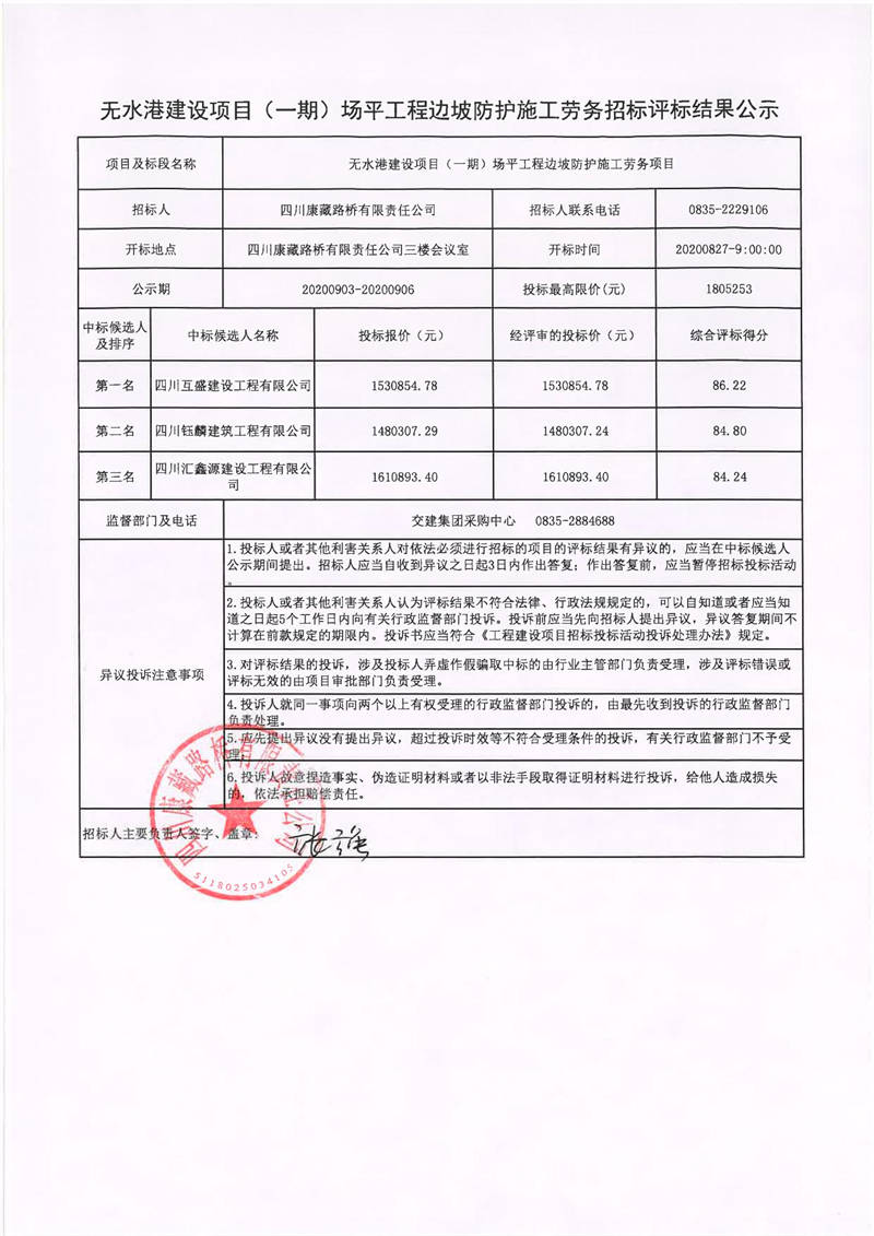 四川康藏路橋有限責(zé)任公司無(wú)水港建設(shè)項(xiàng)目(一期)場(chǎng)平工程邊坡防護(hù)施工勞務(wù)招標(biāo)評(píng)標(biāo)結(jié)果公示