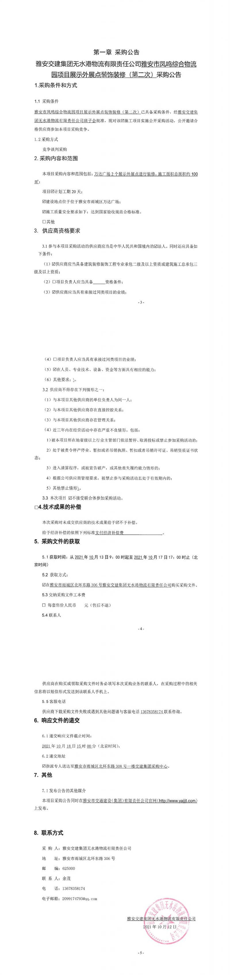 雅安交建集團無水港物流有限責任公司雅安市鳳鳴綜合物流園項目展示外展點裝飾裝修(第二次)采購公告
