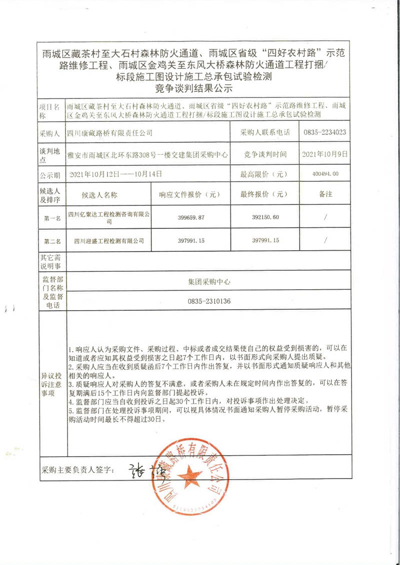 四川康藏路橋有限責任公司雨城區(qū)藏茶村至大石村森林防火通道、雨城區(qū)省級“四好農(nóng)村路”示范路維修工程、雨城區(qū)金雞關(guān)至東風大橋森林防火通道工程打捆/標段施工圖設(shè)計施工總承包試驗檢測競爭談判結(jié)果公示