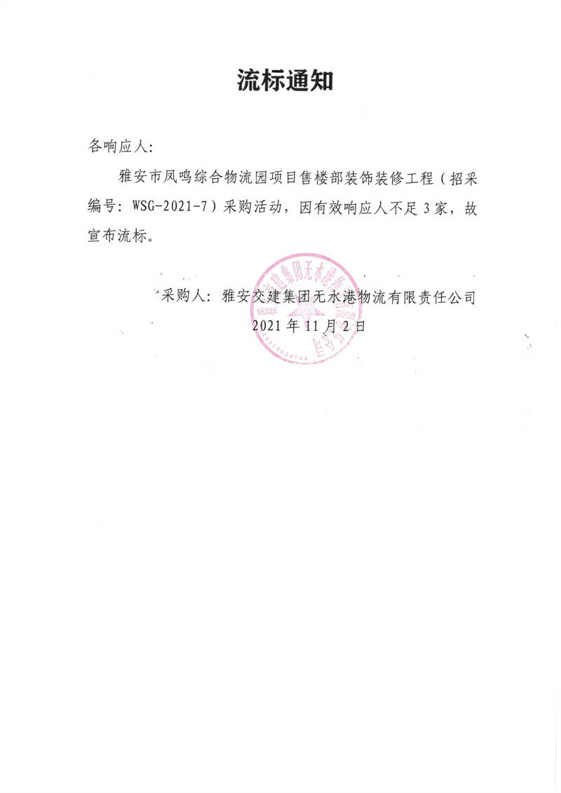 雅安交建集團(tuán)無水港物流有限責(zé)任公司雅安市鳳鳴綜合物流園項(xiàng)目售樓部裝飾裝修工程采購流標(biāo)通知