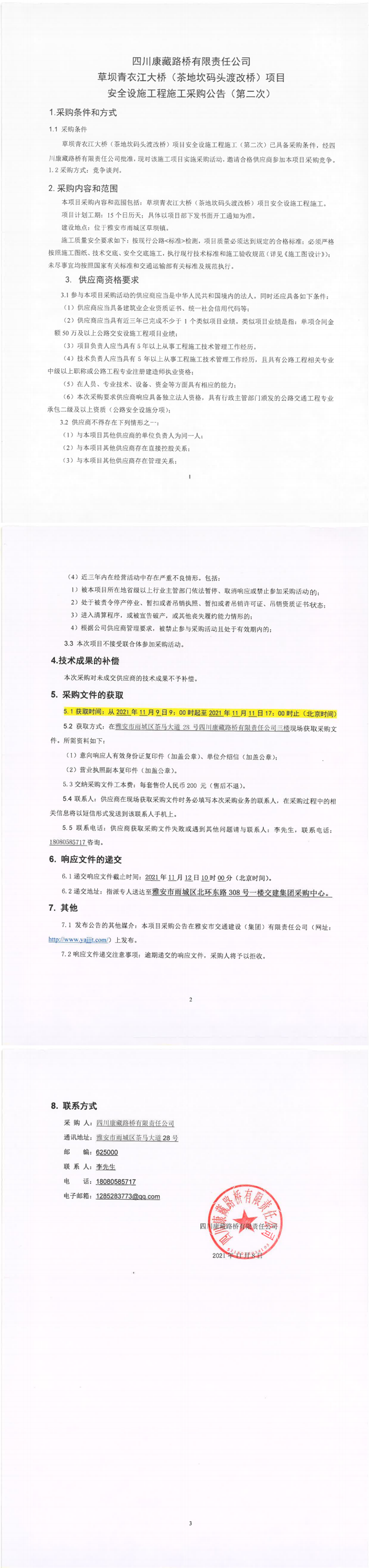 四川康藏路橋有限責(zé)任公司草壩青衣江大橋(茶地坎碼頭渡改橋)項目安全設(shè)施工程施工采購公告(第二次)