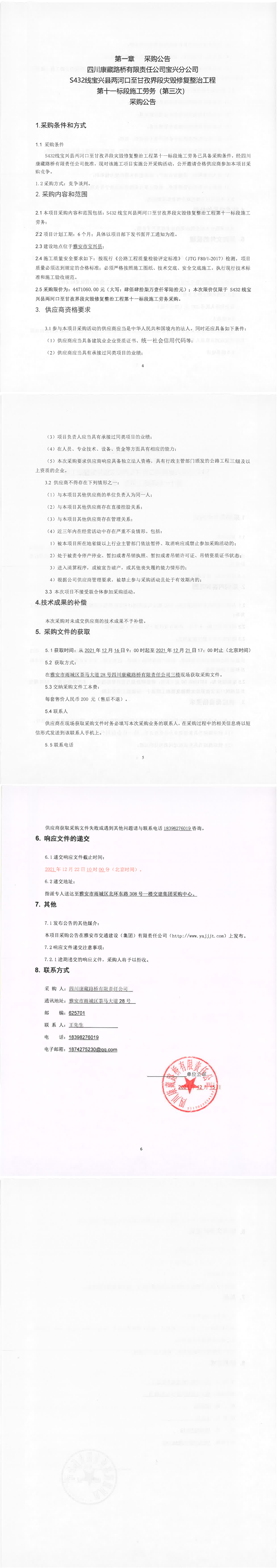 四川康藏路橋有限責任公司寶興分公司S432線寶興縣兩河口至甘孜界段災毀修復整治工程第十一標段施工勞務(第三次)采購公告