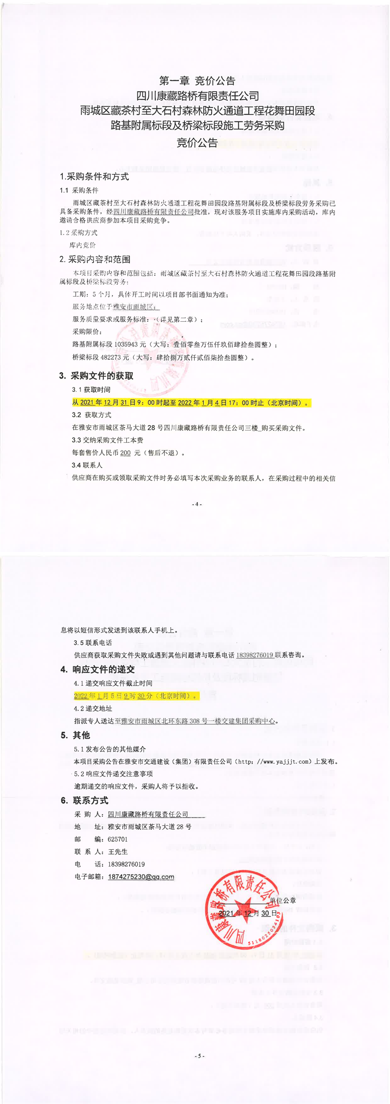 四川康藏路橋有限責任公司雨城區(qū)藏茶村至大石村森林防火通道工程花舞田園段路基附屬標段及橋梁標段施工勞務采購競價公告